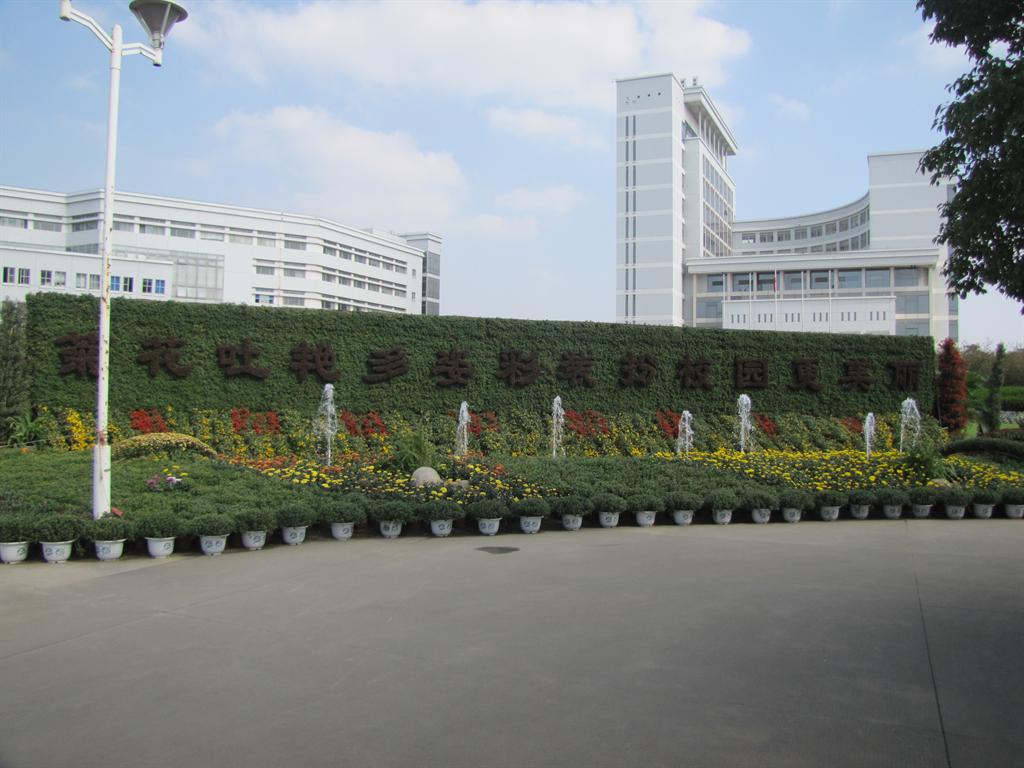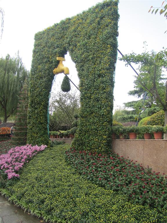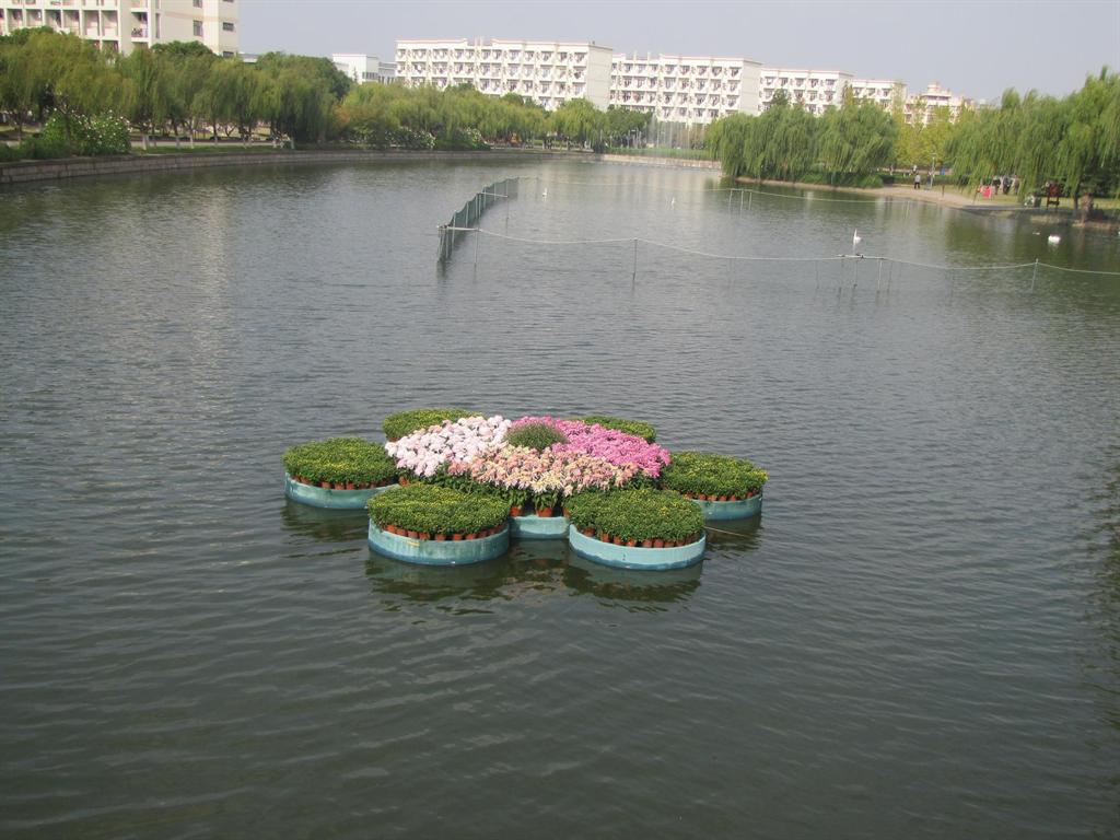 12、滴水成渤 位置:张家港路路牌对面 用小菊种成一块高5.5米、宽3.9米的的底板,中间漏空挂上金色水龙头,龙头下方是用小菊种成的水滴。水滴滴下汇流成用菊花色块摆放成的河流。不积跬步,无以致千里,景点象征着上大人以坚忍不拔的性格默默耕耘,终将积微成著,百川汇海。  13、蕊香菊池 位置:泮池水面上 一朵盛开的娇艳花朵漂浮在泮池水面上,花朵直径3米,花瓣1.5米。金秋十月,秋高气爽、碧波荡漾、菊香四溢。整个景点洋溢着人与自然和谐相处的气息,使人心旷神怡,陶冶着上大人的情操。