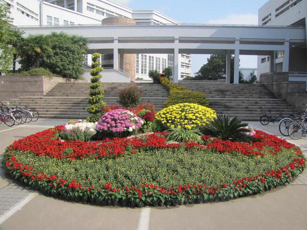 4、流金幻彩 位置:BC楼之间 上千盆黄色小菊从台阶上的花瓶中倾泻而下,撒下瀑布状花束,最后汇聚在楼间广场。景点意欲营造出“廊下阶前一片金,香声潮浪涌游人”的意境。那如瀑布般撒下的花束象征着知识如海水般从教学楼中溢出,蔓延到整个校园。经知识滋养的上大莘莘学子们必定学有所有,绽放光芒。本景点用菊3000余盆。