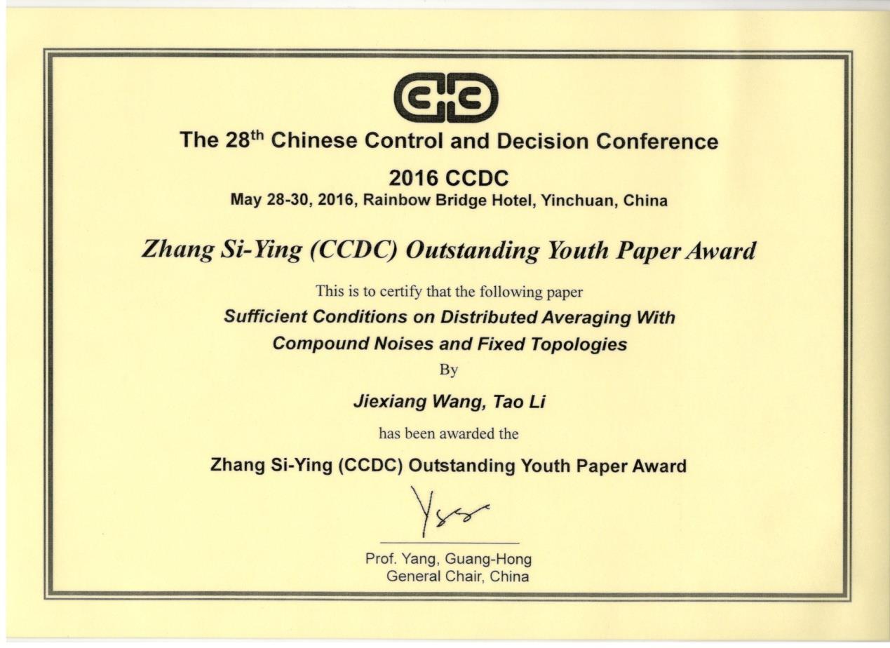 5月29日,我院2014级硕博连读研究生王杰祥与其导师李韬教授合作的论文“Sufficient conditions on distributed averaging with compound noises and fixed topologies”获第28届中国控制与决策会议“张嗣瀛(CCDC)优秀青年论文奖”。该奖项为弘扬我国控制界人所敬仰的资深专家张嗣瀛院士高尚的科学精神与学术品格,激励年轻学者潜心治学设立,是中国控制与决策会议设立的唯一最佳论文奖项。每届CCDC设张嗣瀛优秀青年论文奖1-2篇,提名奖3-4篇。