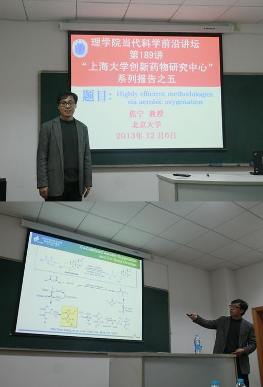 报告会上,焦宁教授结合自身多年来的科学研究,从人们日常使用药物合成方法的发展入手,以“高效的有氧合成方法研究”为主题介绍其课题组近年来的一些工作,包括:基于C-H键活化氧化的有机合成方法学研究;氧气作为环境友好的氧化剂参与的反应等。通过丰富的科研成果、创新的合成理念和幽默轻松的讲解,使在场的每一位师生领略到了化学的独特魅力和焦教授热衷科学,努力钻研的人格魅力。报告后,焦教授与老师和同学们进行了精彩的互动交流。在场师生积极提出问题,焦教授对老师和同学们提出的问题进行了耐心详尽的解答。他所介绍的有机合成研究方法和研究思路对在场师生都有所启发。
